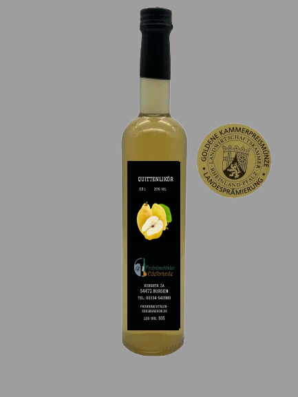 Gönnen Sie sich unseren Quittelikör, ausgezeichnet mit der Goldenen Kammerpreismünze bei der Prämierung der Landwirtschaftskammer Rheinland-Pfalz.
